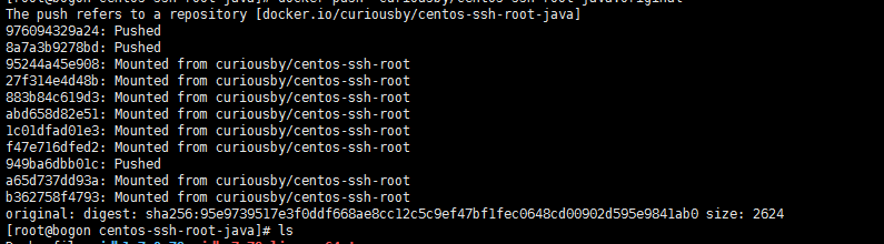 #build run test [root@bogon soft]docker run -d curiousby/centos-ssh-root-java:original 406ffbe6360d5d318a334030e212c03befd51a911c65c9331ecf459ae968d215 [root@bogon soft]# docker images REPOSITORY TAG IMAGE ID CREATED SIZE curiousby/centos-ssh-root-java original 2f56d344c902 37 minutes ago 937MB curiousby/centos-ssh-root original 265bd8a128b3 2 hours ago 325MB curiousby/jenkins original f274428f2ce4 2 hours ago 362MB hub.c.163.com/library/tomcat latest 72d2be374029 4 weeks ago 292MB centos latest 328edcd84f1b 5 weeks ago 193MB hub.c.163.com/library/maven latest e99cade99bfb 2 months ago 620MB hello-world latest 1815c82652c0 3 months ago 1.84kB [root@bogon soft]# docker ps CONTAINER ID IMAGE COMMAND CREATED STATUS PORTS NAMES 406ffbe6360d curiousby/centos-ssh-root-java:original "/usr/sbin/sshd -D" 23 seconds ago Up 23 seconds 22/tcp mystifying_shirley [root@bogon soft]# docker exec -it 406ffbe6360d bash [root@406ffbe6360d /]# [root@406ffbe6360d /]# ls anaconda-post.log bin dev etc home lib lib64 lost+found media mnt opt proc root run sbin srv sys tmp usr var [root@406ffbe6360d /]# [root@406ffbe6360d /]# [root@406ffbe6360d /]# [root@406ffbe6360d /]# [root@406ffbe6360d /]# cd /usr/local/jdk1.7/ [root@406ffbe6360d jdk1.7]# ls COPYRIGHT LICENSE README.html THIRDPARTYLICENSEREADME-JAVAFX.txt THIRDPARTYLICENSEREADME.txt bin db include jre lib man release src.zip [root@406ffbe6360d jdk1.7]# cd .. [root@406ffbe6360d local]# ls bin etc games include jdk1.7 lib lib64 libexec sbin share src [root@406ffbe6360d local]# cd [root@406ffbe6360d ~]# ls anaconda-ks.cfg original-ks.cfg [root@406ffbe6360d ~]# java -version java version "1.7.0_79" Java(TM) SE Runtime Environment (build 1.7.0_79-b15) Java HotSpot(TM) 64-Bit Server VM (build 24.79-b02, mixed mode) [root@406ffbe6360d ~]# 406ffbe6360d [root@406ffbe6360d ~]# exit exit [root@bogon soft]# docker ps CONTAINER ID IMAGE COMMAND CREATED STATUS PORTS NAMES 406ffbe6360d curiousby/centos-ssh-root-java:original "/usr/sbin/sshd -D" 7 minutes ago Up 7 minutes 22/tcp mystifying_shirley [root@bogon soft]# docker stop 40 40