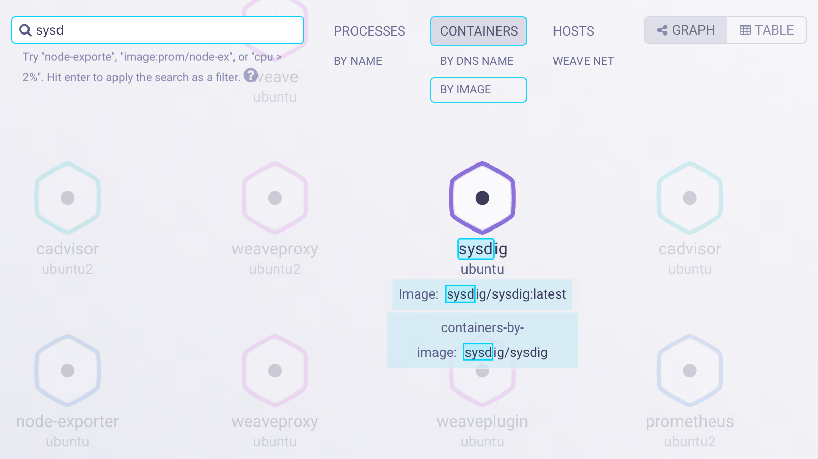 如果部署的容器数量太多(很常见),Weave Scope 还提供了强悍的搜索功能。