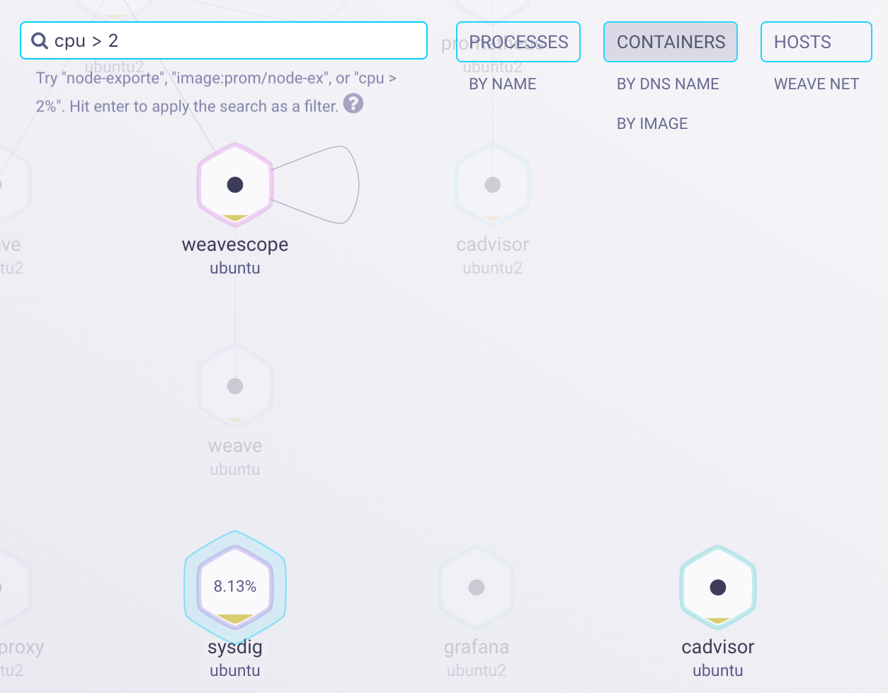 Weave Scope 还支持逻辑条件查询,比如输入 cpu > 2,立刻回找出 CPU 利用率高于 2% 的容器。
