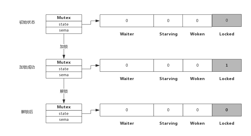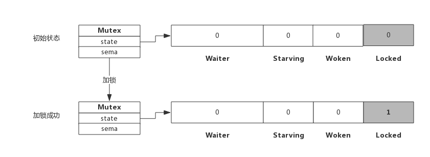 加锁过程会去判断Locked标志位是否为0,如果是0则把Locked位置1,代表加锁成功。从上图可见,加锁成功后,只是Locked位置1,其他状态位没发生变化。