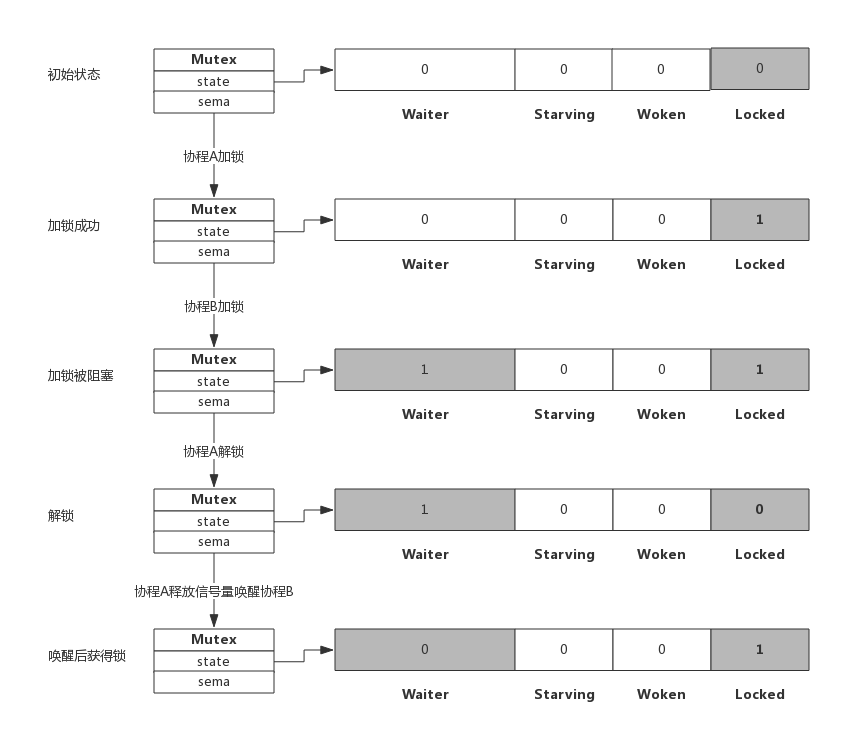 协程A解锁过程分为两个步骤,一是把Locked位置0,二是查看到Waiter>0,所以释放一个信号量,唤醒一个阻塞的协程,被唤醒的协程B把Locked位置1,于是协程B获得锁。