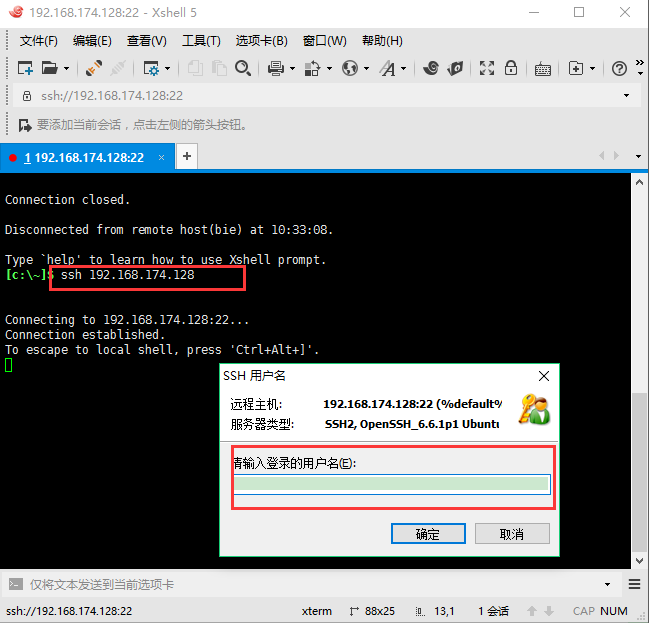2:使用Xsheel软件远程链接自己的虚拟机,方便操作。输入自己ubuntu操作系统的账号密码之后就链接成功了;
