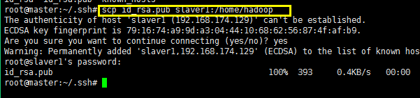 将密钥rsa.pub拷贝到slaver1的home目录下面的hadoop目录下面:(scp,ssh copy的缩写,远程拷贝文件或者目录)
