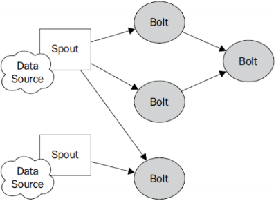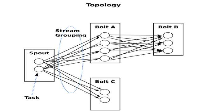一个topology是spouts和bolts组成的图, 通过stream groupings将图中的spouts和bolts连接起来,如下图: