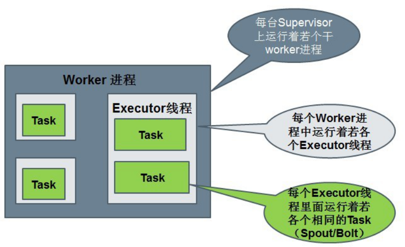 一个topology可能会在一个或者多个worker(工作进程)里面执行;