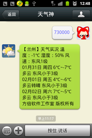 这里就是说了一句话给对方,就获得了查询结果。这比那些要输入名称、拼音、区号、邮编的查询方式更进了一大步,因为不用再输入繁琐的名称了,而且大多数人大多数情况下都是固定在一个地方,不会改变地理位置,所以这个功能对他们来说还是很实用的。