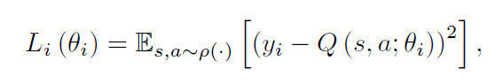 在强化学习领域,这通常是一个线性函数,但是有时候非线性函数估计也用,如:神经网络。我们将带有权重的神经网络函数记为:Q-network。一个Q-network 可以通过一个序列的损失函数 $L_i(\theta_i)$ 最小化来实现每一次迭代 i 的改变。
