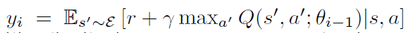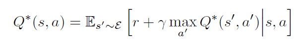 最优的动作值函数 服从一个重要的等式,叫做:Bellman equation. 这个基于如下的观察:如果下一个时间步骤的序列 s'的 最优值 Q^*(s', a') 对于所有可能的动作 a' 都是已知的,然后最优策略就是选择动作 a' 使得期望值 $r + \gamma Q^*(s', a')$最大化: