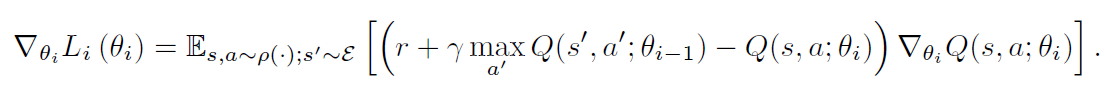 不是在上述梯度中,计算全部的期望,比较适合的方法是利用 SGD 的方法来优化损失函数。If the weights are updated after every time-step, and the expectations are replaced by single samples from the behaviour distribution and the emulator, respectively, then we arrive at the familiar Q-learning algorithm.