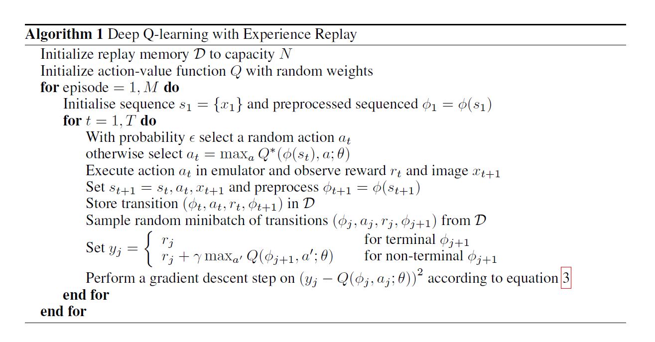 和 TD-Gammon 以及类似的 online方法相对,我们利用一种称为 experience replay 的技术,我们将 agent 每一个时间步骤的经验存储起来,$e_t = (s_t, a_t, r_t, s_{t+1})$,将许多 episodes 存储进一个 replay memory。在算法内部循环中,我们采用 Q-learning 更新,或者 minibatch updates,来采样 experience,从存储的样本中随机的提取。在执行 experience replay之后,agent 根据贪婪算法,选择并且执行一个动作。由于采用任意长度的 histories 作为神经网络的输入是非常困难的,我们的 Q-function 作用在由函数作用之后,固定长度表示的 histories。算法的全称,我们称为 Deep Q-learning。