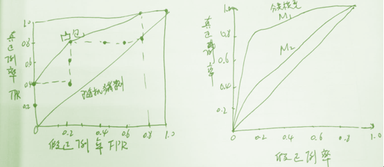 由以上数据绘制ROC曲线(左图)和两个分类器模型M1、M2的ROC曲线