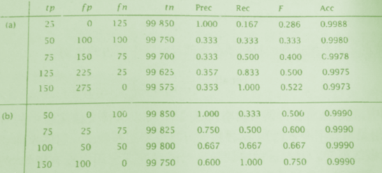 (b)表显示有同样大小的准确率,但是F度量值仍在增加。F度量倾向最大化真正确TP,而准确率仅仅针对错误的数值敏感。
