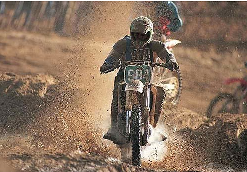 图片文字识别结果:“A person riding a motorcycle on a dirt road,”