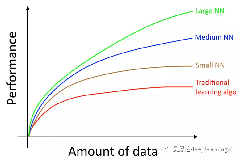 图说明:小数据集时,可能一些传统的机器学习算法通过人工的设计特征等,其效果会优于深度神经网络,但随着数据量的增强,深度神经网路的优势愈发明显。