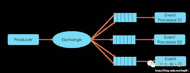 再来看“事件分发”的场景,架构如下图所示,使用event name/id来作为RabbitMQ的routing key的名字。Event Processor 01对event 01 和event 02感兴趣,则在启动Consumer Worker时,将自己的Queue绑定到这两个routing key上即可,其他Event Processor也是如此,这样便完成了事件的订阅。当有事件发布时,消息便会按照event name/id被投递到对应的Queue中。