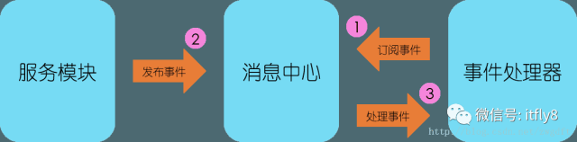 我们需要的是一个事件分发系统,在各个功能模块中将对应的事件发布出来,由对其感兴趣的处理者进行处理。这里涉及两个角色:A对B感兴趣,A是处理者,B是事件,由事件处理器完成二者的绑定,并向消息中心订阅事件。服务模块是后端的业务逻辑服务,在不同的事件点发布事件,事件经过消息中心分发给事件处理器对应的处理者。整个流程如下图所示。这边是典型的订阅发布模式。