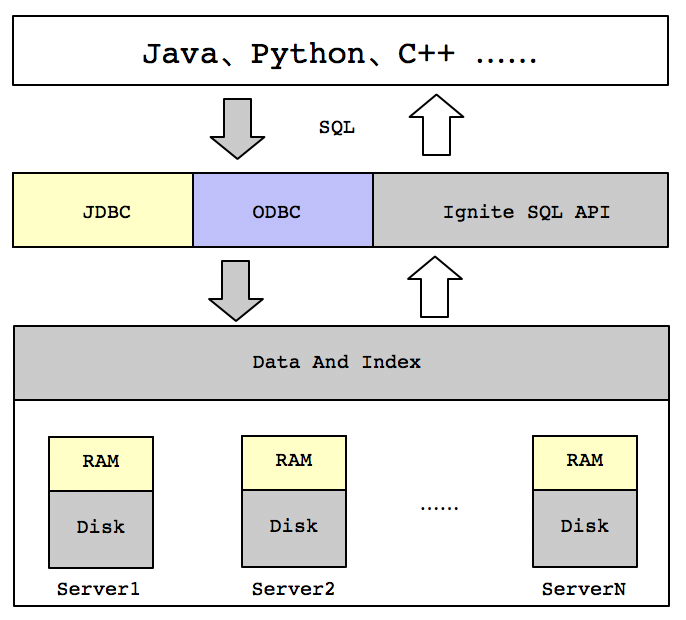在Apache Ignite中提供了分布式SQL数据库功能,这个内存数据库可以水平扩展、容错且兼容标准的SQL语法,它支持所有的SQL及DML命令,包含SELECT、INSERT、DELETE等SQL命令。依赖于固化内存架构,数据集和索引可以同时在内存和磁盘中进行存储,这样可以跨越不同的存储层执行分布式SQL操作,来获得可以固化到磁盘的内存级性能。可以使用Java、Python、C++等原生的API来操作SQL与Ignite进行数据交互,也可以使用Ignite的JDBC或者ODBC驱动,这样就具有了真正意义上的跨平台连接性。具体架构体系,如下图所示: