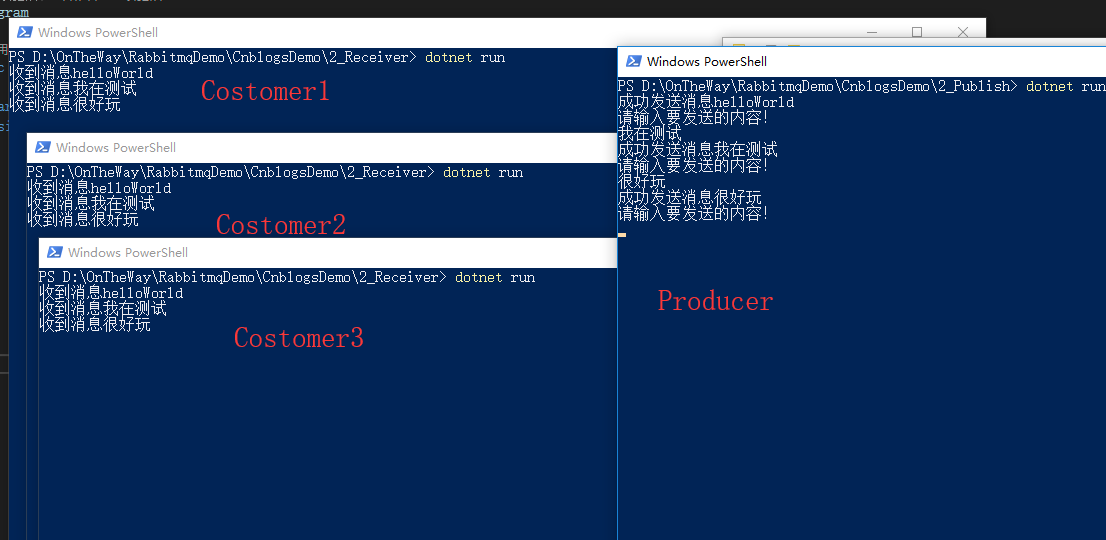 运行了三个消费者,当生产者发出消息时,三个消费者都收到了相同的消息。可以理解为广播模式。(Customer单词拼写错了,图片修改不方便,就不改了,大家将就一下)