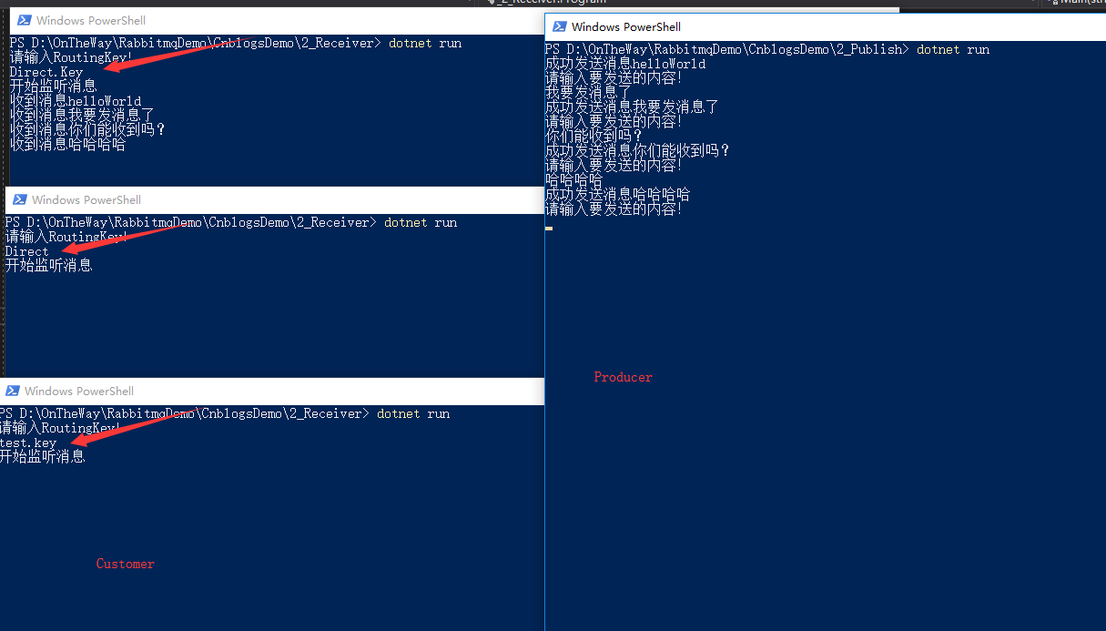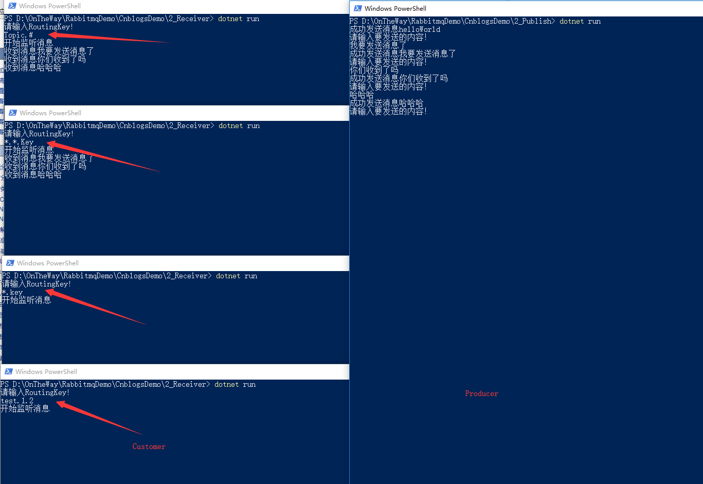 所以*.*.Key Topic.#与Topic.Demo.Key匹配,而其他两个*.Key和test.1.2当然是不匹配的,所以没有收到消息。