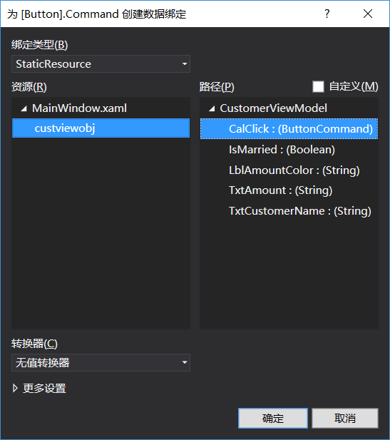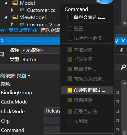 在UI上添加一个按钮来让它把按钮的行为和暴露为ICommand的方法关联起来。现在可以打开这个按钮的属性,找到命令属性,然后点击创建数据绑定。