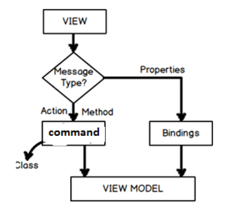 如果你想用属性来传递数据到view model 我们需要用到bindings,如果你想要从view传递actions我们需要用到commands.