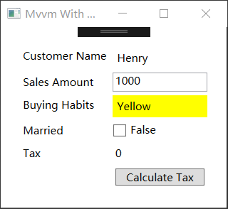 应用不只是包含textboxs和labels,还包含actions,如按钮和鼠标事件等。接下来我们加上一些像按钮这样的UI元素来看MVVM类怎么演变的。与之前的UI相比,这次我们加上一个"Cal Tax"按钮,当我们点击这个依赖于“sales amount”的按钮时,它会计算税费并显示在同窗口内。