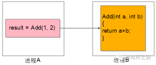 这段代码的时候,我们知道,我们传入了1,2两个入参数,调用了本地代码段中的一个Add函数,得到了result出参。此时,传入数据,传出数据,代码段在同一个进程空间里,这是本地函数调用。