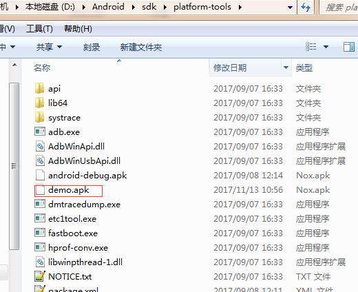 最后,win+r打开终端,切换到上面的platform-tools文件夹里面,运行:adb install demo.apk,出现success就添加成功了。