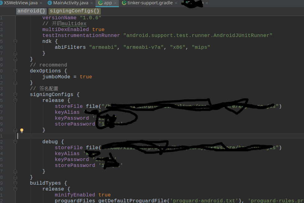 android { defaultConfig { ndk { //设置支持的SO库架构 abiFilters 'armeabi' //, 'x86', 'armeabi-v7a', 'x86_64', 'arm64-v8a' } } } dependencies { compile "com.android.support:multidex:1.0.1" // 多dex配置 //注释掉原有bugly的仓库 //compile 'com.tencent.bugly:crashreport:latest.release'//其中latest.release指代最新版本号,也可以指定明确的版本号,例如1.3.4 compile 'com.tencent.bugly:crashreport_upgrade:1.3.5' // 指定tinker依赖版本(注:应用升级1.3.5版本起,不再内置tinker) compile 'com.tencent.tinker:tinker-android-lib:1.9.6' compile 'com.tencent.bugly:nativecrashreport:latest.release' //其中latest.release指代最新版本号,也可以指定明确的版本号,例如2.2.0 }