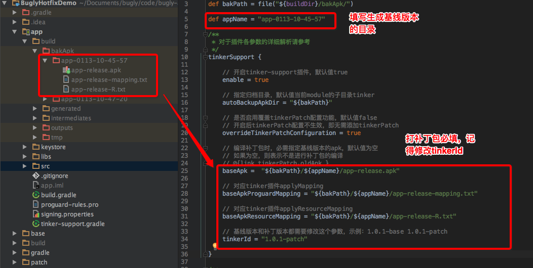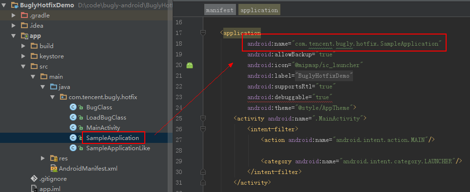 注意:tinker需要你开启MultiDex,你需要在dependencies中进行配置compile "com.android.support:multidex:1.0.1"才可以使用MultiDex.install方法; SampleApplicationLike这个类是Application的代理类,以前所有在Application的实现必须要全部拷贝到这里,在onCreate方法调用SDK的初始化方法,在onBaseContextAttached中调用Beta.installTinker(this);。