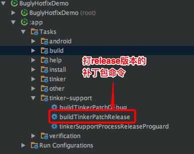 以上就配置完成了,生成基准包,在tinker-support.gradle中修改基准包的路径名称,运行下面的脚本即可生成patch.如图