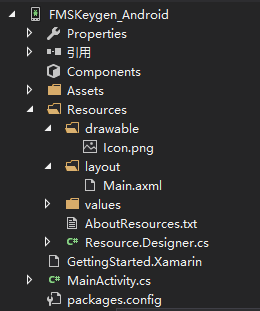 Android App使用的是显示与逻辑分离的设计模式,虽然我基本是做Winform的,也是基本能看懂的。Resources\layout文件夹里放视图文件,而代码逻辑文件放在最外层,整个项目的结构如下图:
