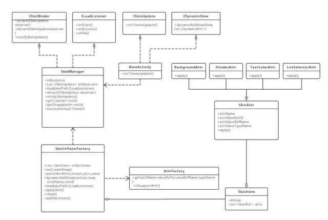 SKinManager为整个皮肤包的管理类,负责加载皮肤包文件,并得到该皮肤包的包名skinPackageName,和这个皮肤包的Resource对象skinResource,这样整个皮肤包的资源文件我们就都可以拿到了。在加载得到皮肤包的Resource之后,通知每个注册过(attach)的页面(Activity),去刷新这些页面所有保存过的需要换肤的View,进行换肤操作。