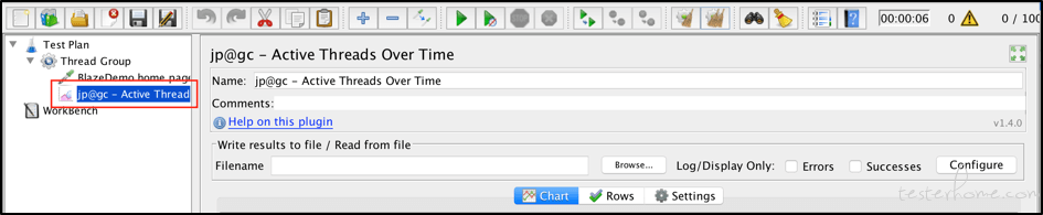 这样的图表可以帮助我们可视化负载模式并检查我们要测试的内容。 JMeter不提供开箱即用的这些选项,但您可以轻松安装“自定义插件包”,其中包含许多有用的侦听器(可通过Jmeter-GraphsGeneratorListener此链接找到安装说明)。 其中一个插件被称为"Active Threads Over Time"。 添加该侦听器: