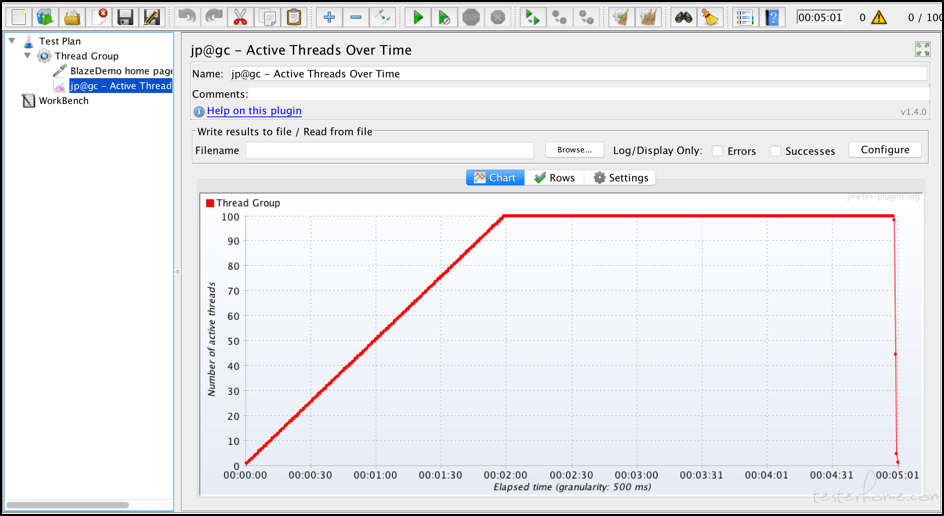 因为测试持续时间是300秒,所以在2分钟内加速,我们有3分钟的保持时间。 重要的是,在加速结束并且所有用户都启动并运行之后,有足够的保持时间。 保持时间确认系统可以处理负载并且性能保持稳定且不会恶化。