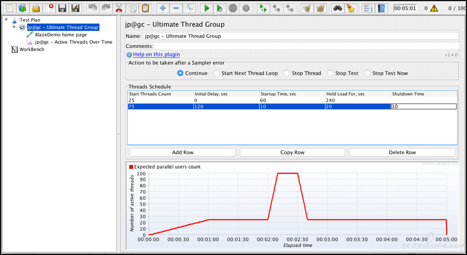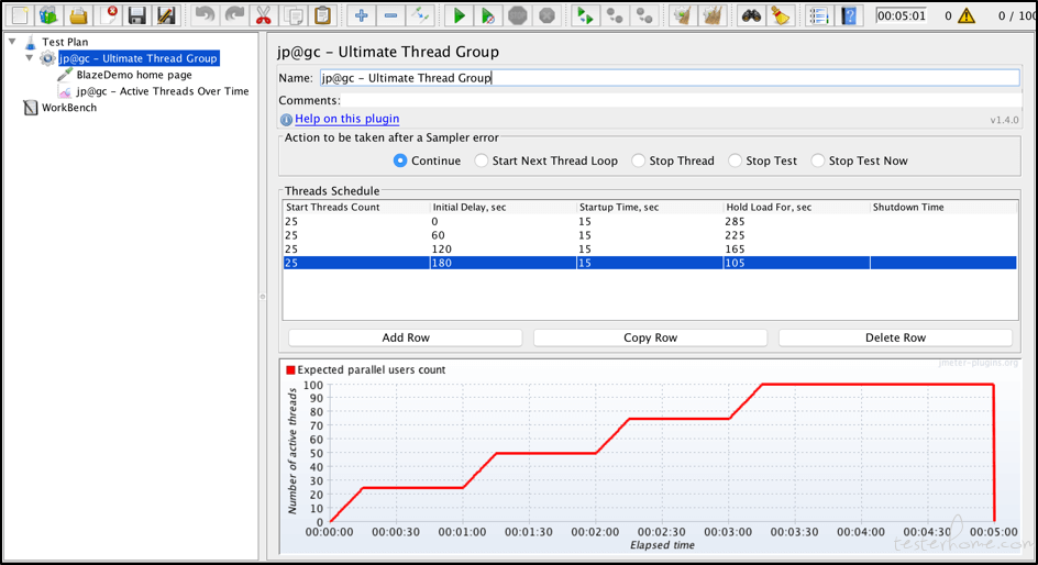 3.Ultimate Thread Group提供了一个'Threads Schedule' 线程计划表,您可以在其中配置不同的线程组。 您可以决定线程数量('Start Threads Count'),每组开始添加到测试执行之前的延迟('Initial Delay,sec'),线程组的加速期('Startup Time') ,sec'),在减速前线程组的持续时间('Hold Load For,sec')以及指定所有线程组应该关闭的速度('Shutdown Time')。 所有线程组同时启动,但每个线程组都有自己的Intial Delay“初始延迟”值,这有助于分别从每个组中分离用户。