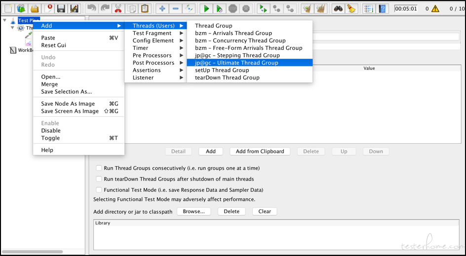 右键单击左侧的元素选项卡 - >添加 - >线程(用户) - >jp@gc - Ultimate Thread Group