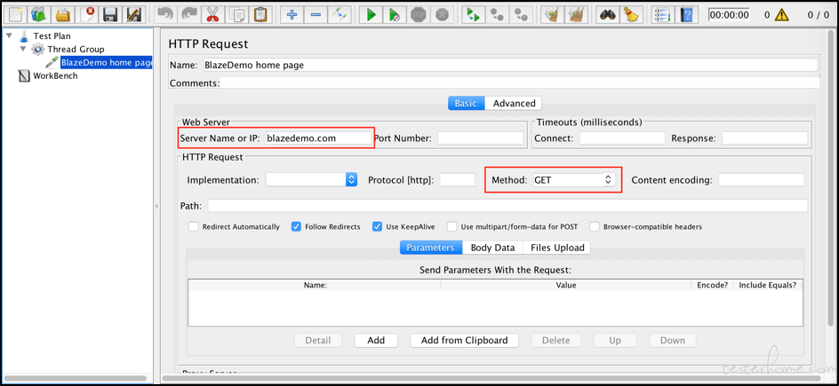 我将其名称更改为“BlazeDemo home page”。 添加“blazedemo.com”作为服务器名称,并确保将该方法设置为GET。