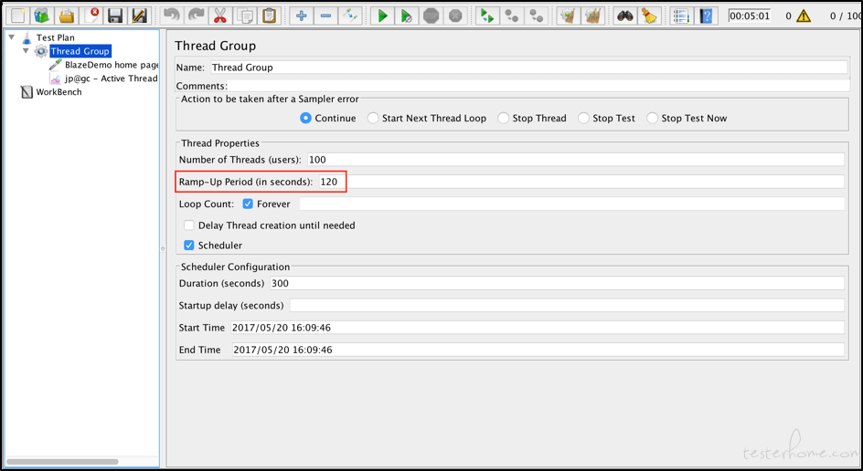 将线程数的值更改为100.现在让我们假设您要运行我们的测试5分钟。 因此,您需要在Duration“持续时间”字段中指定值300。 现在,让我们将线程组中的“Ramp-Up Period”字段保持为空。