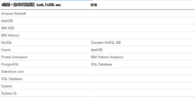 IBM DataWorks Forge 支持的来源和目标数据库: