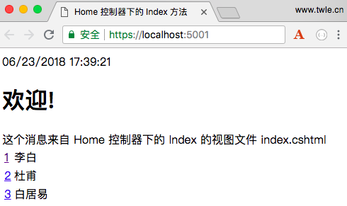 <div>这个消息来自 Home 控制器下的 Index 的视图文件 index.cshtml </div>