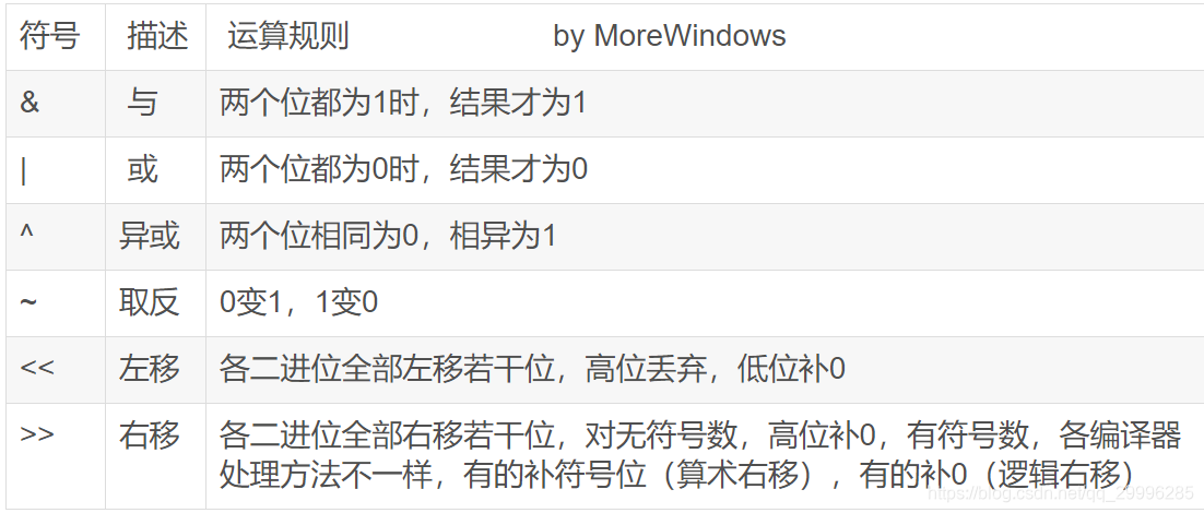 “<<” 和 ">>" 的优先级低于 “+” 和 “-”。 “~” 按位求反 “^”按位异或 “|”按位求或 “&”按位求与