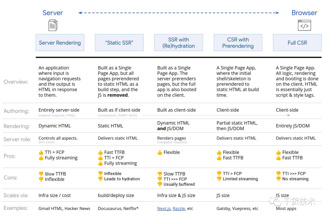 当决定渲染的方法的时候,首先要测量并且理解你的瓶颈是什么。思考静态渲染或者是服务器端渲染是否可以满足你90%的需求。用最少的JS发布HTML也是极好的,其会得到一个可交互的用户体验。下面是一个方便的信息图,显示了服务器-客户端频谱。