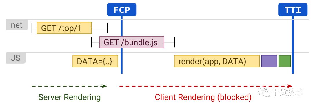 rehydration的SSR的主要的缺点就是它对Time To Interactive有着明显的缺点,即使它会提高First Paint。它经常看起来是具有欺骗性的加载和交互,因为它实际上在js以及事件处理完成之前,是无法响应输入的。在手机端可能会花费数秒钟才会让页面真正可以使用。