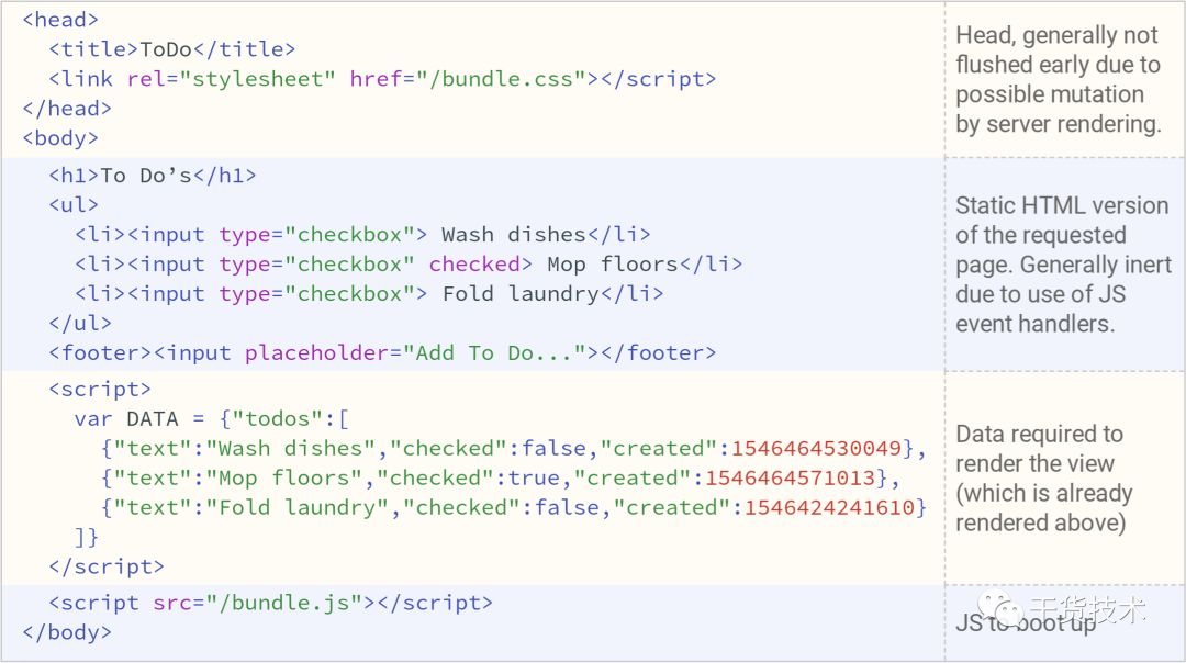 正如你所看到的,在响应中服务器不仅返回一个应用程序UI的描述给浏览器,而且还吧相关的数据也一并返回了过来,当启动客户端的时候,UI会再次实现渲染一次。其只在bundle.js已经完成加载和解析以后,UI才会变为可交互的。