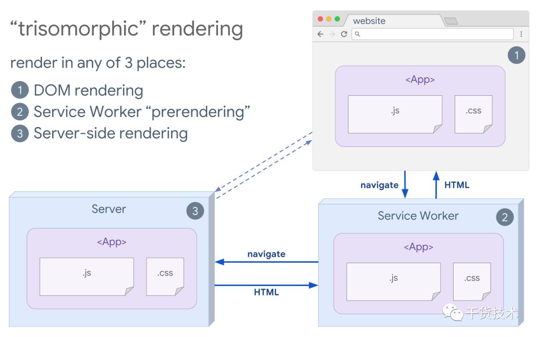 如果service workers对于你来说是一个选项的话。那么对于“trisomorphic”渲染来说,你可能也是感兴趣的。这是一种可以将初始/非JS应用在流服务器上的一种技术,然后让您的服务工作者在安装后渲染为HTML以进行导航,这可以使缓存的组件和模板保持最新,并启用SPA样式导航以在同一会话中呈现新视图。当您可以在服务器,客户端页面和服务器工作程序之间共享相同的模板和路由代码时,此方法最有效。