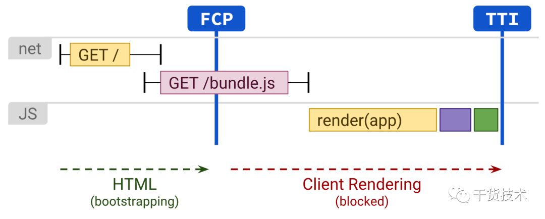 客户端渲染意味着在浏览器中使用Javascript直接渲染页面。所有的逻辑,数据获取,模板和路由都在客户端处理。